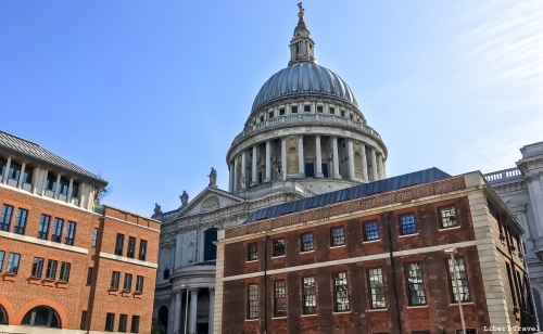 セント・ポール大聖堂の見どころは、直径34mの大ドームに描かれた「聖パウロの一生」という見事な天井画。まさに芸術的統合を果たした作品です。また、外観にある西側2本の塔も特徴的。高さは111m、ビル28階分に相当し、立体的な柱や細部まで豪華に作られた彫刻が並びます。