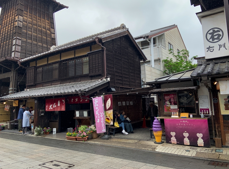 これらの建物の1階では、お店を営んでいるところも多く、一帯は川越一番街商店街とも呼ばれています。和菓子店やお茶屋さん、酒店など、古くから営業していると思われる店舗が見られます。