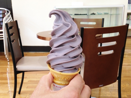 写真左は、ハスカップソフトクリーム(260円税込)です。甘酸っぱさがクセになりそうな味。カフェメニューは、写真右のテラスでもいただくことができます。なお、テラスは雨天時および冬期間は閉鎖する場合もあります。