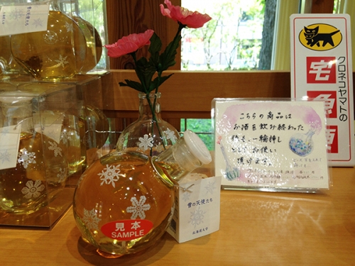 写真左は、雪の結晶があしらわれたボトルに入った梅酒です。お酒を飲み終わったあとは一輪挿しとして使えるそうです。