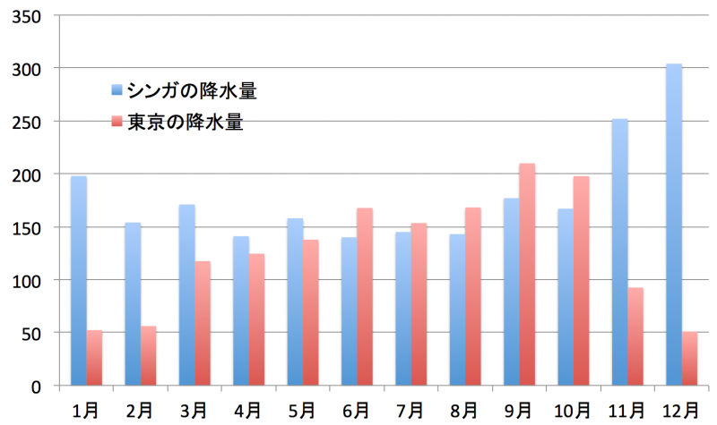 上のグラフはシンガポールの降水量と東京の降水量の比較です。一年を通して、シンガポールでは東京と同程度か、それ以上に雨が降ります。