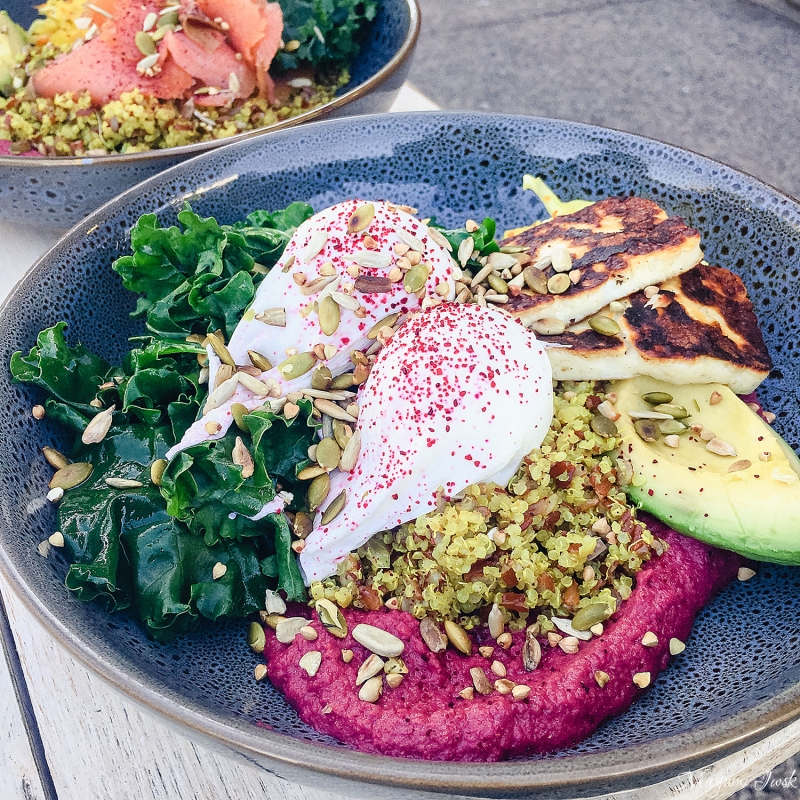 デポの人気メニューの一つ「Rainbow Breakfast Bowl(レインボー・ブレックファスト・ボウル)」は、その名の通りレインボーのような色鮮やかな一皿。鮮やかなピンク色のビーツフムスをはじめ、スパイシーなキヌアやケールなど野菜がたっぷり入っています。まろやかなポーチドエッグと塩気のあるハロウミ・チーズの相性も抜群です。