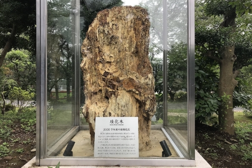 また、聖なる森の入り口となる聖門に向かう道には、高さ2.2m、幹周り2.9m、重さ2.5tもの2000万年前のものとされる珪化木(植物化石)があります。