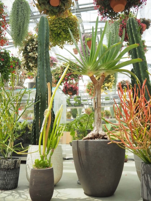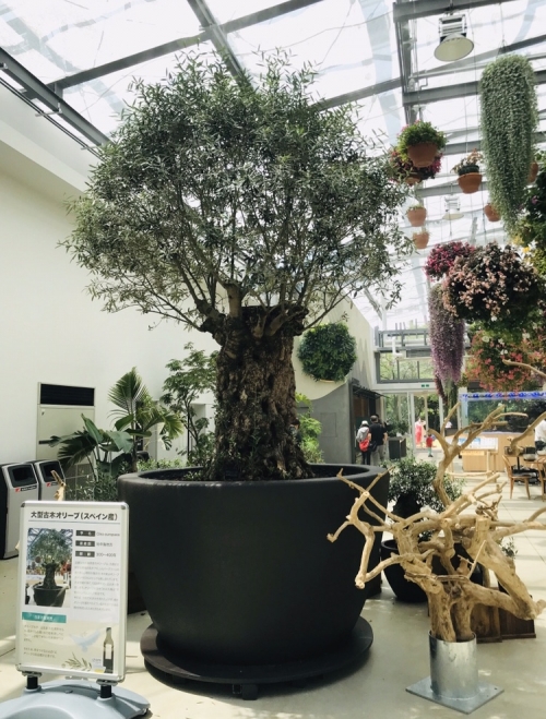 綺麗な花々をバックに写真を撮るのもオススメです。太陽の位置によって、フラワーシャンデリアの見え方が変わるので、時間ごとに様々な花の表情を見る事ができますよ。またシャンデリアの下には、様々な植物の展示もあります。樹齢300年〜400年の大きなオリーブは迫力満点です!