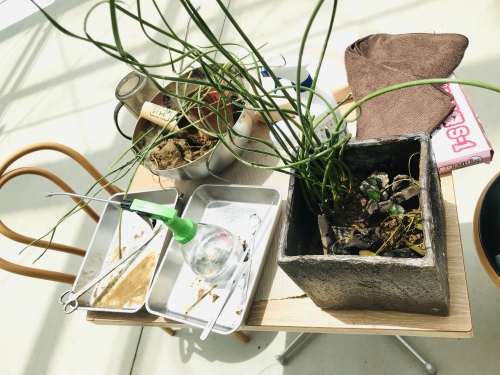 こちらも、流れは睡蓮のビオトープと同じです。まずは、好きな草、流木、石を前の机から選びます。