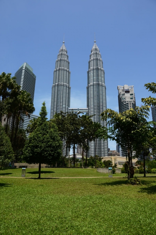 ツインタワーに併設する緑豊かな公園。朝はジョギングや散歩をする地元の人で、日中はプレイグラウンドで遊ぶ子供たちでにぎわいます。キッズ専用の水遊び場もあるので、お子さんを連れて行く方は着替えをお忘れなく。毎晩20時から行われるライトアップと噴水のショーはアダルトな雰囲気。