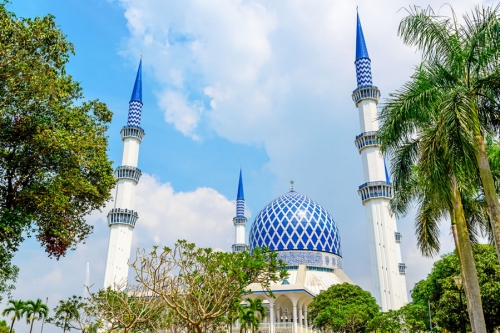 クアラルンプール都心から車で30分程、近郊のシャーアラムという町にあるモスク。正式名称は「Sultan Salahuddin Abdul Aziz Mosque(スルタン・サラディン・アブドゥル・アジズ・モスク)と言います。マレーシア最大のモスクで、東南アジアでも2番目に大きいそうです。特徴は美しい青と中心の大きな円形ドーム。このドーム、なんとモスクとしては世界最大なんだそう。ドームを囲むようにしてそびえ立つ塔はミナレットと呼ばれるイスラム教の宗教施設特有の塔。こちらも高さ140m程と、とても高いです。入場は無料で、女性は全身を覆うローブとヒジャブを借りて入場できます。男性は露出が少なければそのまま入場できますが、男性も足を出すのはNGなので、ショートパンツの場合はローブを借りましょう。