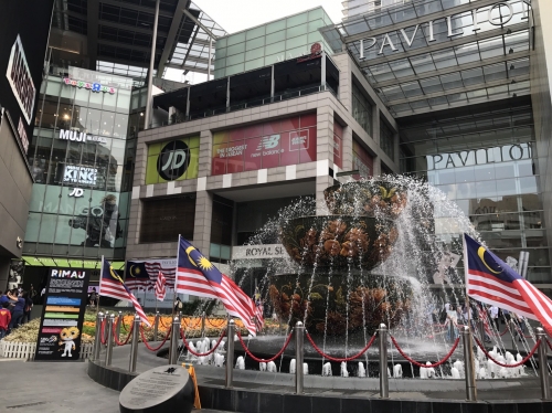 マレーシア最大の屋台街「アロー通り」から徒歩数分の場所に、繁華街の雰囲気とは一転して煌びやかな建物が目を惹くエリアがあります。そんなエリアの中でも特に際立っているのが、地上7階の巨大ショッピングモール「パビリオン」です。国内外の有名ブランドが400店舗以上も集まっており、ショッピングやお土産探しを楽しめます。レストランやカフェも豊富にあるので、食事やカフェ休憩で立ち寄るのもおすすめです。