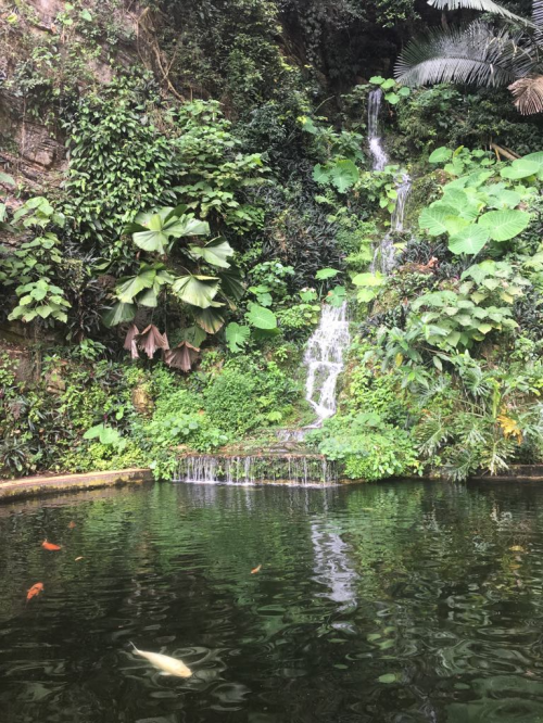 洞窟の奥から外にでると、緑豊かなガーデンになっていてお散歩をすることができます。ガーデンの中心には大きな池があり、その池を囲むようにお散歩コースがありますので、自然に癒されながらゆっくりとお散歩してみてはいかがでしょうか。お散歩中はとても暑いので、日傘や帽子を持っていくことをお勧めします。