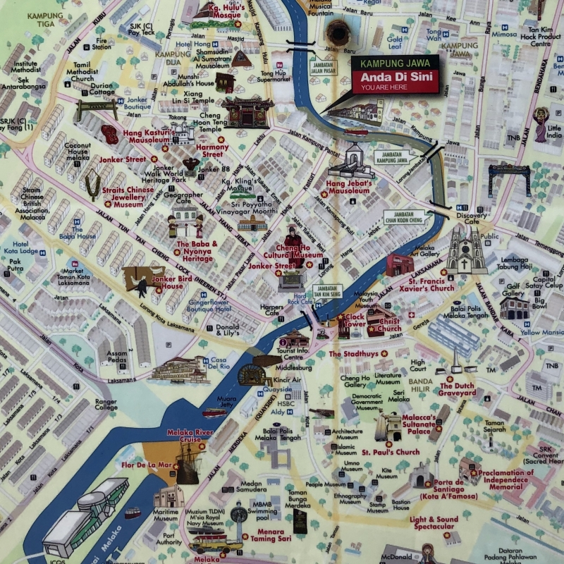 マラッカ川沿いのお散歩は、マラッカ滞在中に是非していただきたい事のひとつです。上の写真のYOU ARE HEREの地点から河口付近までの往復で、約5kmとウォーキングにはちょうど良い距離をご紹介します。