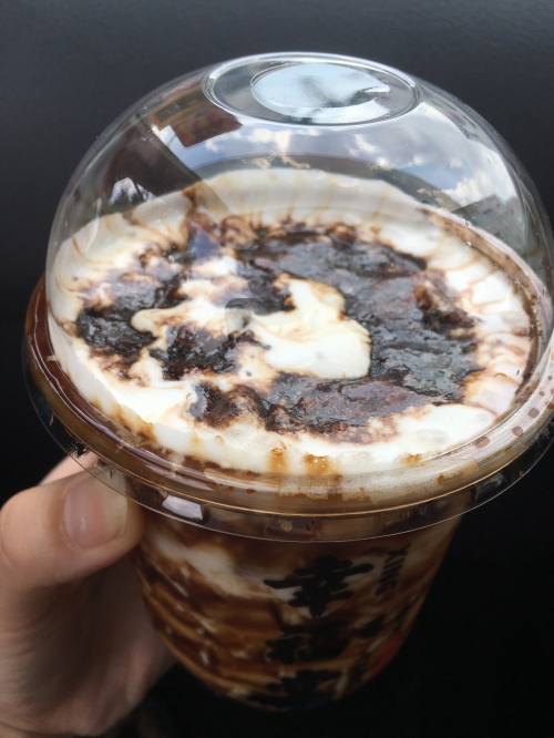 2種類のサイズのタピオカが入っているのが印象的です。冷たいミルクと温かい黒糖タピオカのコンビネーションが癖になりますよ。