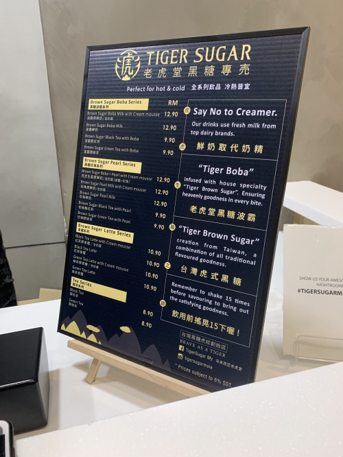 虎のロゴが印象的な台湾発祥のタピオカ店です。一番人気は、Brown Sugar Boba + Pearl with Cream mousse。お値段RM12.90(約320円)です。