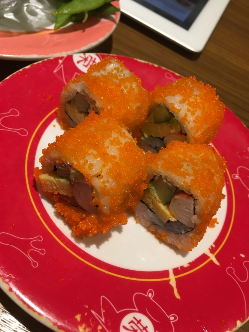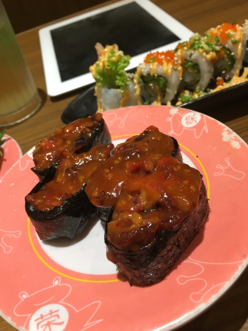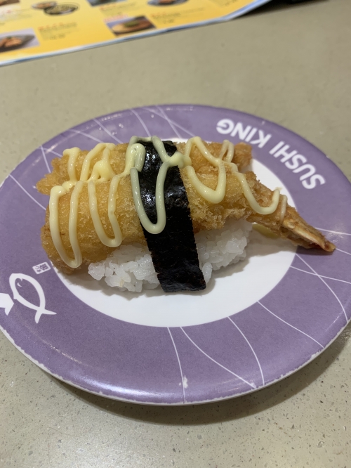 写真上はスパイシー海老天ぷらRM18.88(約481円)です。ボリュームがあって、日本の回転寿司と比べても同じくらいのクオリティーでした。