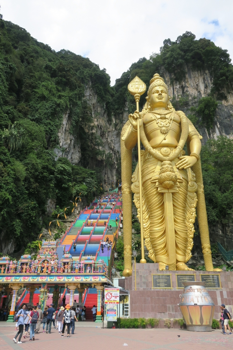 まるでテーマパークのような雰囲気と、見たことのない光景にびっくり!「バトゥ洞窟」はヒンドゥー教の聖地と言われる寺院で、金色の巨大な像はヒンドゥー教の神様ムルガンです。像の横で更に圧倒的な存在感を放っているカラフルな階段を上っていきます。