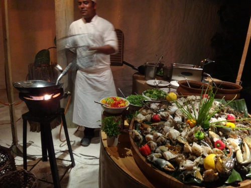 カクテルパーティがある日は屋台風にディナーが楽しめます。我々の滞在時はアジア料理の屋台がたくさん並んでいました。その場で調理してくれるシーフードを使ったスリランカ料理や、モルディブのヘディカと呼ばれる揚げ物など、普段はなかなか巡り合わない料理が並びます。