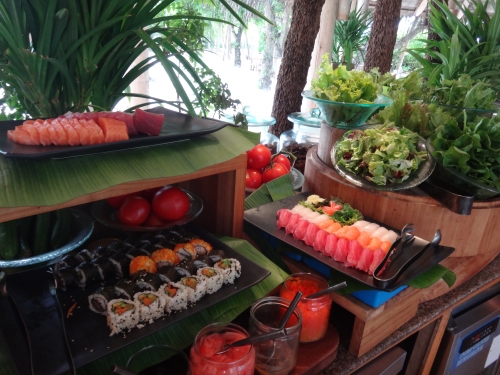 ランチの時はお寿司もあります。新鮮な魚介類が使われ、シャリも程よい硬さで握られていて、外国にいるとは思えないほどです。デザートコーナーも充実しています。