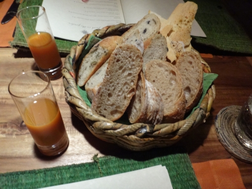 スターターのドリンクはソネバオリジナルのもの。カゴには食べきれない程のパンが。鶏肉もジューシー、リゾットも程よくふんわりとしていて、日本人好みの味。大きなクレームブリュレもとても美味しいです。