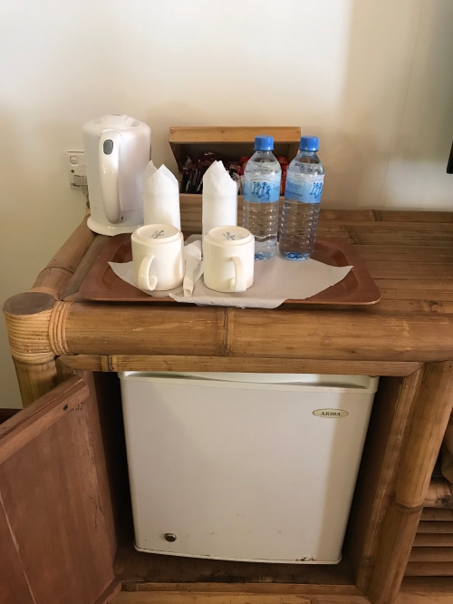 部屋には、冷蔵庫、湯沸かし器、コーヒー、紅茶、ミネラルウォーター、カップがあるので、いつでも自由に飲むことができます。また、セーフティーボックスもあるので、貴重品は必ずしまいましょう。