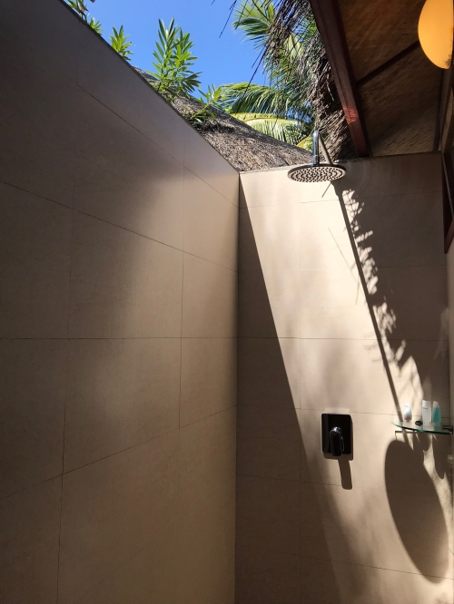 部屋もバスルームもとても広く、家族連れも快適に過ごすことができます。トイレも独立しているので気兼ねなく入れる嬉しいデザイン。裏口から南国の雰囲気が漂うシャワールームに直接入れるので、部屋が砂で汚れることがないのは嬉しいですね。