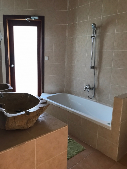 バスルームには、シンクが2つ、バスタブ、シャワー、トイレがあり、シャワールームへはベランダからも入れるようになっています。泳いだ後、部屋を通らずに直接バスルームへ行くことが出来るんです。