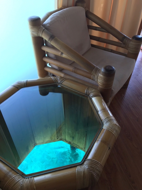 部屋には、天窓付きのベッドや海を見下ろせるガラス張りのテーブルもあり、部屋にいながら透き通る海や魚を見ることが出来ます。ガラスのテーブルの下まで泳いで行って、テーブルの上から写真を写せば、ちょっと変わった写真も撮れますよ。
