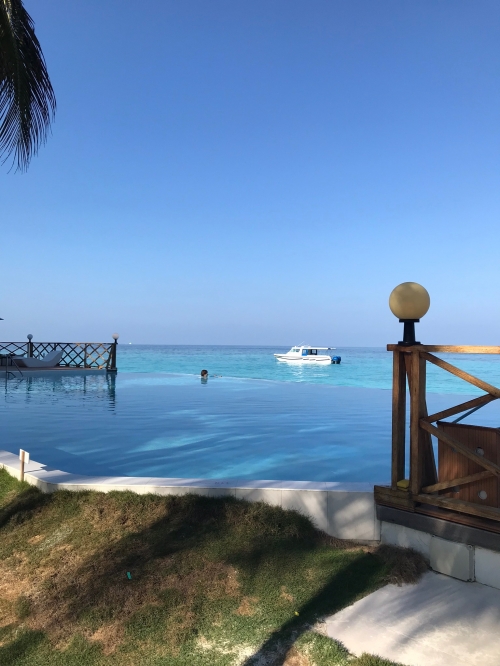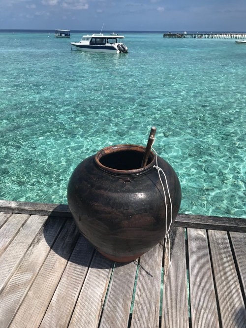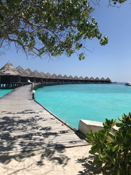 日本からモルディブへは、スリランカ、香港、シンガポールなどを経由して行くのが一般的です。モルディブのマレ空港に到着したら、ホテルの送迎ボートで島へ行きます。高速船で約20分の比較的空港から近いリゾートなんです。送迎は事前に予約をしておきましょう。送迎ボートは往復で大人US $100(約¥11,200)かかります。
