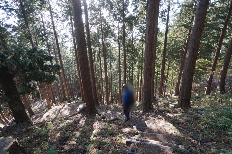 木々が斜面のそこかしこに倒れています。大きな木は、パッと視界に入ってくるのでまだいいのですが、小さな枝が登山道に積もっていて、それが足やズボンに引っかかってしまい、足を取られて転んでしまいそうです。下山は集中力を保ちつつ歩かないと危ないようです。そしてこんなふうに階段が長く続く道もありました。長い階段は、ひざとももなど、足にきます!
