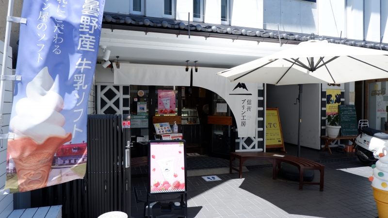 最初にご紹介するのは、スイーツ専門店「信州プリン工房」。松本にあるジャムメーカーがプロデュースしたお店で、果肉が入ったコンフィチュールと、安曇野産の牛乳と天然のバニラビーンズで作ったプリンやソフトクリームを提供しています。