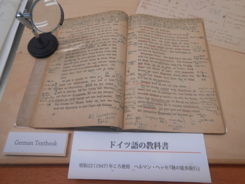 2階では、全国の旧制高等学校と旧制松本高等学校の資料を展示しています。ビッシリ書き込みのされた教科書や教材からは、当時の学生が熱心に勉強している姿、そして教員が熱弁を振るっている姿を想像できます。