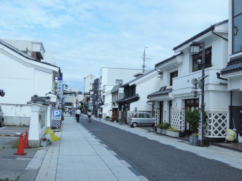 四柱神社の表参道として発展したの縄手通りと違い、問屋街として栄えた中町通りには白壁の土蔵が立ち並んでおり、縄手通りとは雰囲気の違う町並みです。