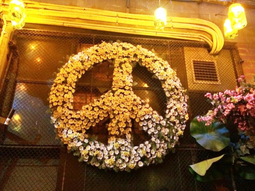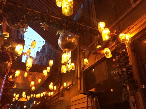 お店はビルのすき間にある、ちょっとした路地にあります。オレンジ色のビン型ちょうちん明かりに照らされた店内は、花とグリーンにあふれ、壁にはいろいろな装飾が施されています。どれもこれも可愛らしく、女性客が多いように感じられました。