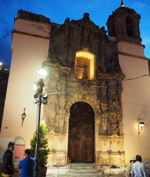 ホテルやレストランが立ち並び観光客が一番多く集まる場所にある、こちらのサンディエゴ教会。建物自体は派手ではないですが、夕方には周囲を楽団が練り歩き、途端に異国情緒溢れる風景に早変わり。夜遅くまで賑やかで、こちらも昼と夜の表情の違いを楽しめます。隣に建つフアレス劇場とともに、グアナフアトの街のスポットのひとつです。