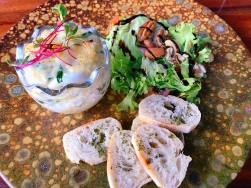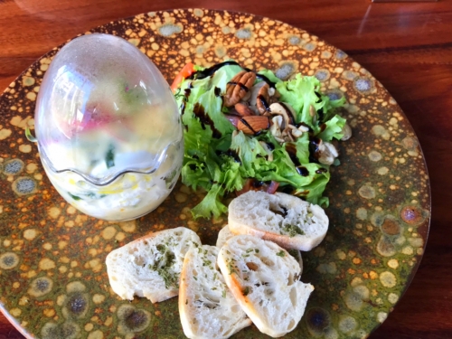 また卵料理は、容器が卵型でとってもかわいいです。中には温かい卵が使ったソースが入っていてほんのり酸味があり、刺激的な創作料理を楽しむことができます。サイドにはナッツがゴロゴロ入ったサラダなどもついてきて女子力高めの一品です。