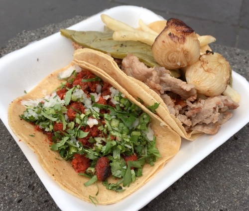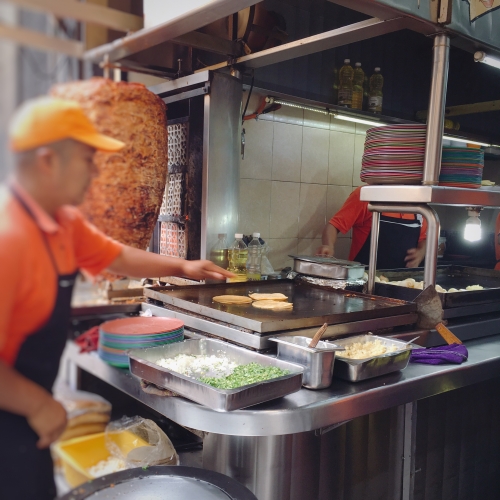 おすすめはTaqueria Amandas。観光スポットのソカロ広場の近くにあり、英語メニューもあり、イートインとテイクアウト両方あって、なおかつ店先で肉を切ったり焼いたりしてくれる、いいことづくめのお店です。日本のガイドブックや、地元の宿にある周辺オススメマップにも載っているので、安心度も高いです。