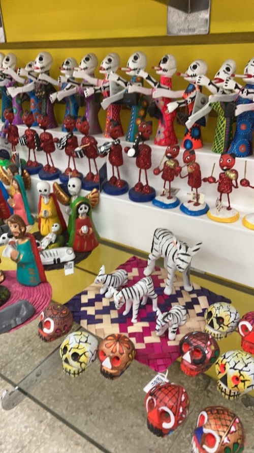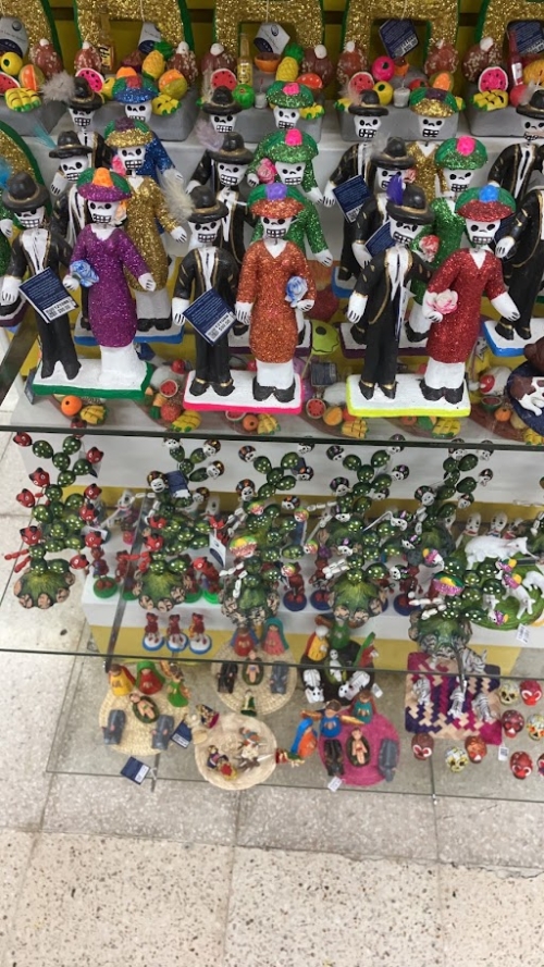 人気なものは陶器のカラベラ(頭蓋骨)ではないでようか、頭蓋骨をカラフルにペイントされたものだったり、いろんな衣装を身にまとったガイコツ、サボテンと一緒になっているガイコツ値段も大きなもピンキリです。