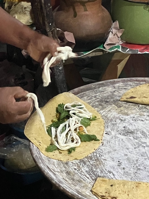 このチーズが最初に作られたのがメキシコ南部のオアハカ州であることに由来しており、長いひも状のチーズを割いて、ケサディーヤやエンパナーダに散らして食べられることが多いです。