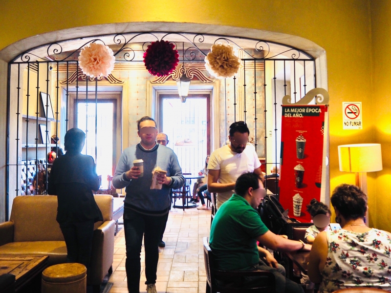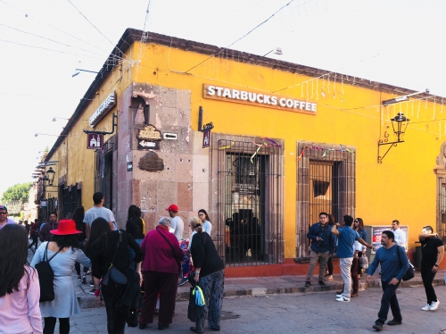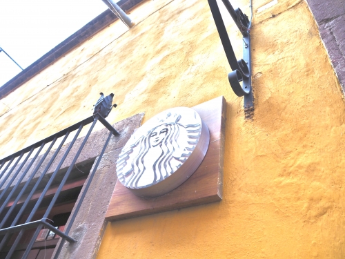 サンミゲル教区教会の近くにスターバックスがあるのですが、この街に溶け込むような建物になっています。壁が黄色なのです。また、ロゴもシルバーになっています。店内も「サンミゲルデアジェンデ」式の、とても可愛らしい内装です。
