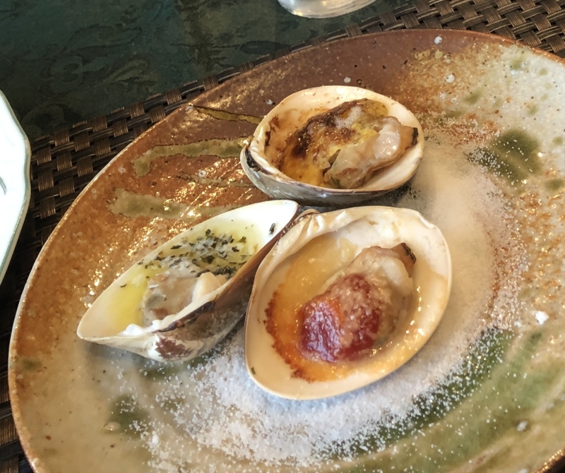 まずは、洋風焼き蛤3種 。トマトソース、オリーブオイルバジル、チーズの3種です。パン粉が少しふりかけてあり、焼かれて香ばしくなっています。アラカルトだと、3種×2セットの6個入りで1,500円。