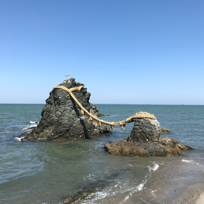 また神社の沖合700mには「夫婦岩」という二対の岩があり、鳥居の役割を担うほか、大海原を背景にうつくしい風景がみられます。