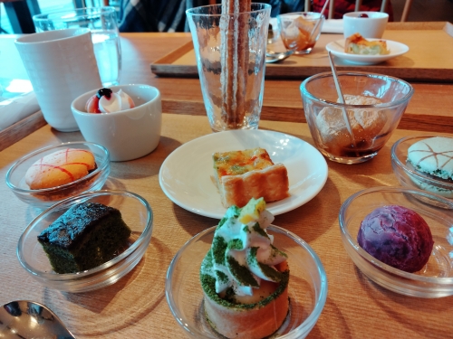 ホテルに到着後は、ほっと一息つきたいところ。アフタヌーンティーのサービスもあります。メニューは焼きたてのマフィン、キッシュ、マカロンなどがあり、コーヒーや紅茶と一緒にリラックスした時間を満喫することができます。テラスの外には熊野の山並みが広がり、開放感抜群!