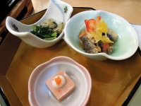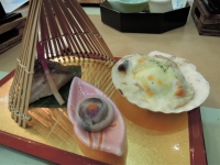 写真:ゆきたか 2017年度のテーマは熊本県。くまもんや熊本城が映し出された。 |  写真:ゆきたか |  写真:ゆきたか 見た目も美しい前菜。 |