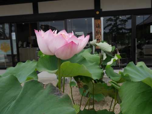 御影堂の奥にある池でも蓮の花が楽しめます。こちらは桃色で一重咲きの花を咲かせる大賀蓮(おおがはす)という品種です。大賀蓮は、植物学者の大賀一郎氏が2000年以上前の地層から発見した種を発芽したもので、この蓮池にあるものは、平成17年に関東別院から寄贈されたそうです。