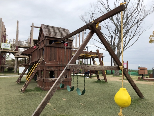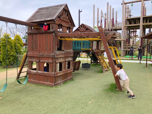 コンセプトは 「ちびっこ砦」。アメリカ製のウッドアスレチック遊具は無料で遊べます。すぐそばにはベンチもあるので親も安心して見守れます。