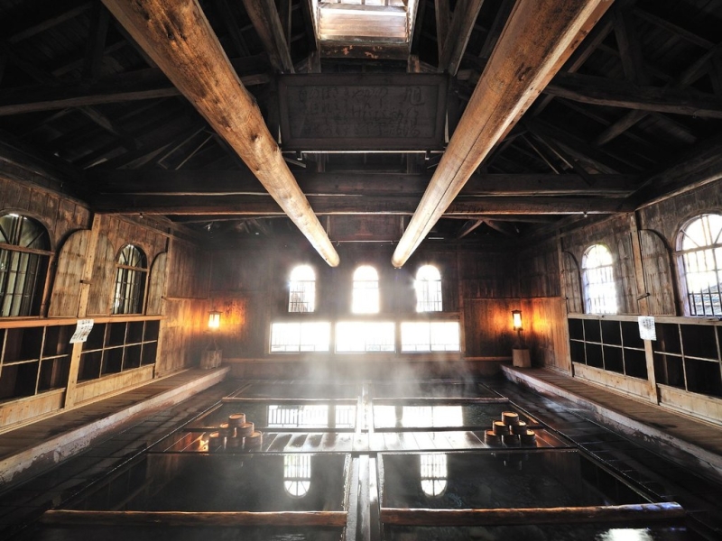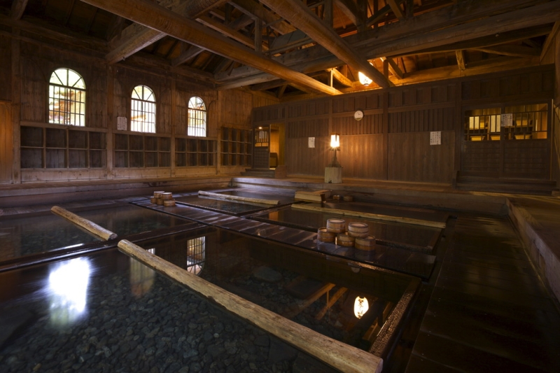 明治28年に建てられた鹿鳴館風の建物で、明るいときと暗くなってからと違った趣きを味わえます。純度100%の源泉が下に敷かれた玉石の間からポコポコと自然湧出しており、新鮮な温泉を楽しめます。混浴ですが、20:00~22:00までの2時間は、女性専用となります。