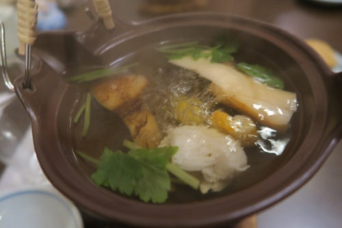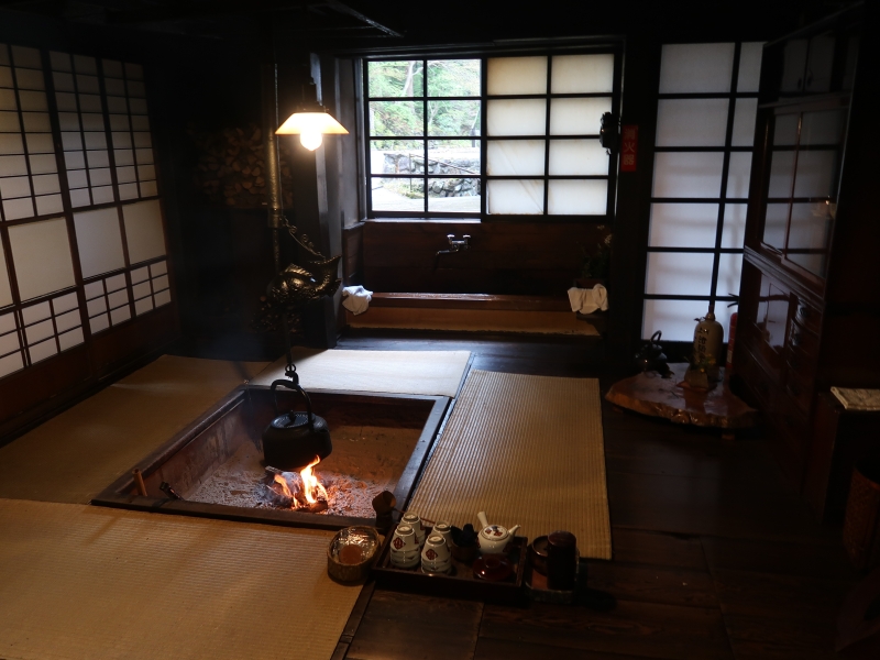 玄関すぐ左手にある囲炉裏。鉄瓶からお茶を自由に飲むことができます。今では珍しくなった囲炉裏で、家族の団欒や、他の宿泊客の方との交流など自由に楽しめます。