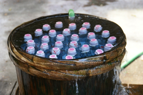 川面に近い場所にある別棟に造られた女性専用浴場。壁には、長寿のお祝いが書かれた看板がかかっています。