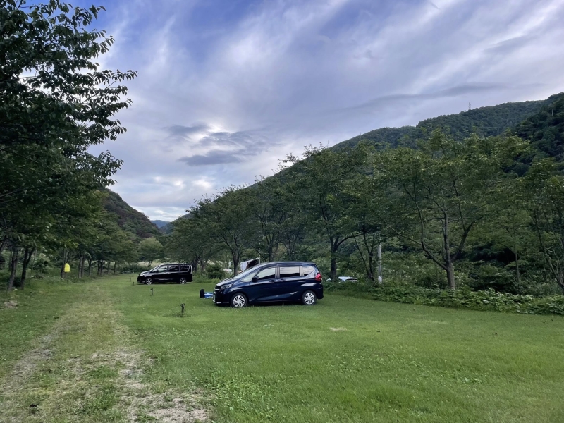 芝の区画サイトは広々としていて、車を停めてもテントや焚き火などのスペースが十分にあります。