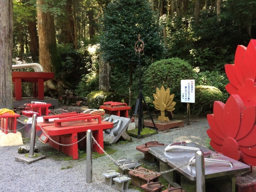 御真殿の脇には、天狗の履き物である下駄がたくさん!下駄は左右一対が揃って使える物ということで、夫婦和合のご利益もあるとか。