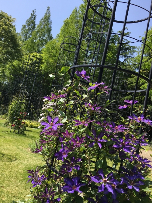 5〜6月は大輪系と呼ばれる、その名の通り花が大きい種類が見頃。つる植物用のタワーに咲き誇る大きくて色鮮やかなクレマチスが密集しています。咲いている花がない寂しい期間がないように、いつの時期でもどれかの種類が見頃になるよう各種揃えているそうです。