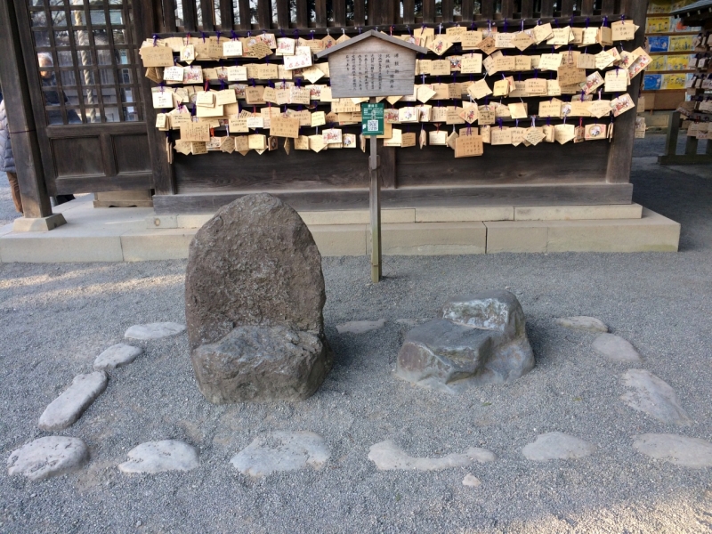 平家追討の祈願で訪れた際に、源頼朝・北条政子夫婦が腰掛けて休息したといわれる石です。向かって左の大きな石に頼朝が、右の石に政子が腰掛けたとされています。流人生活から脱して戦に赴こうと決断した頼朝と、それを見守る妻の政子、何を語ったのでしょうね。